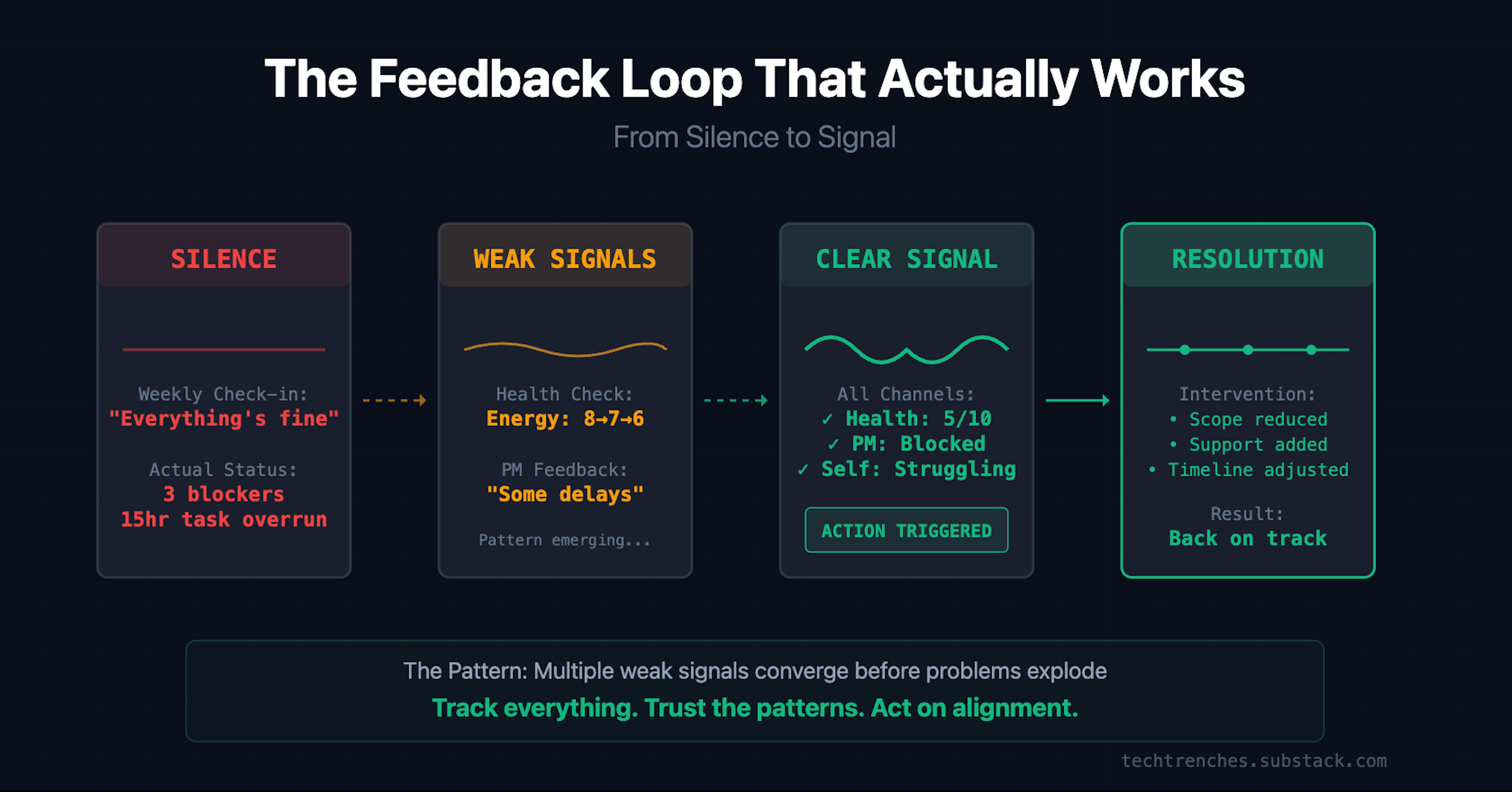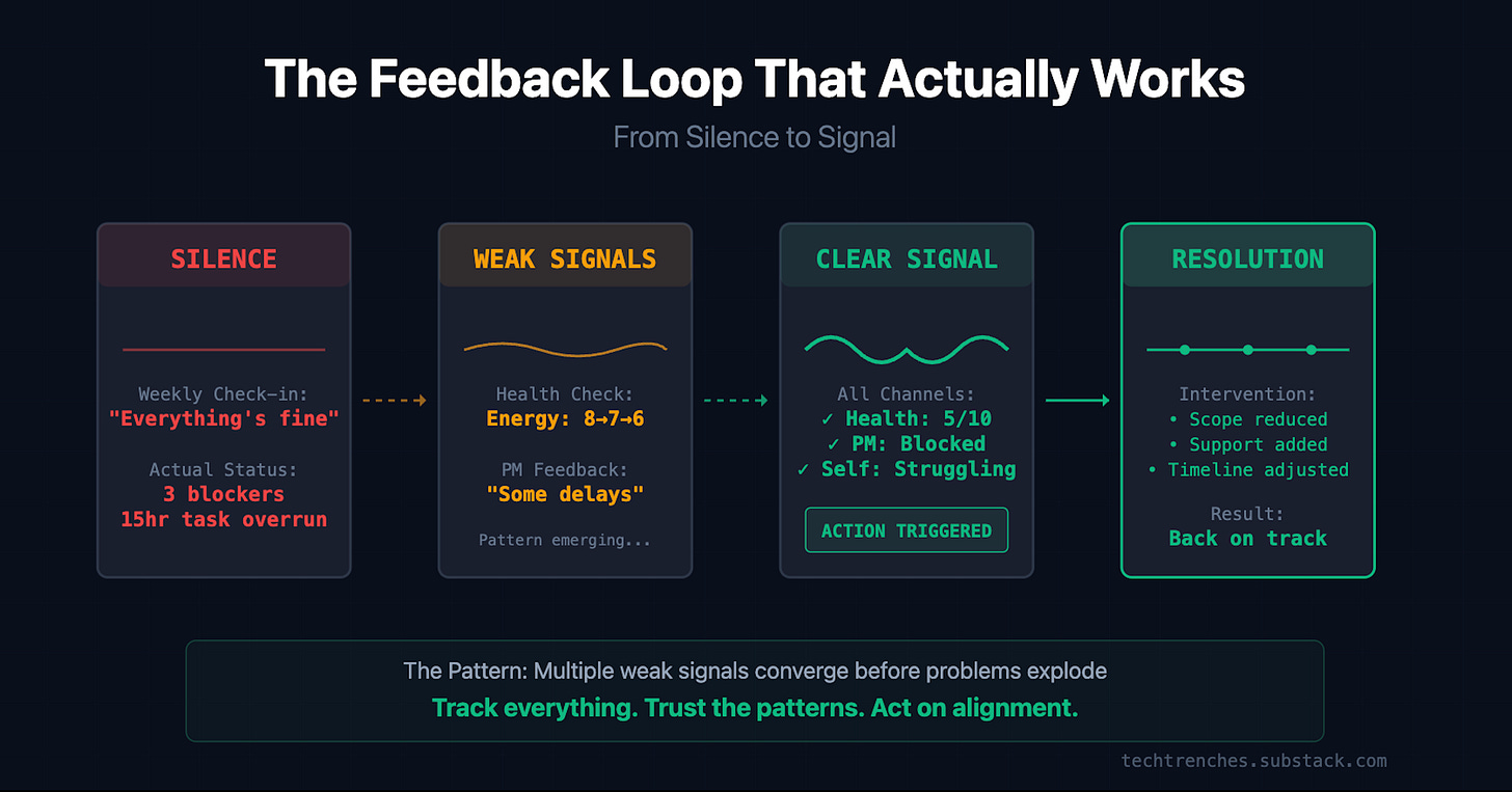 This week’s feedback was particularly valuable. Two senior developers independently shared concerns about technical direction, process inefficiencies, and knowledge distribution. Issues that wouldn’t surface in a standup or sprint review.